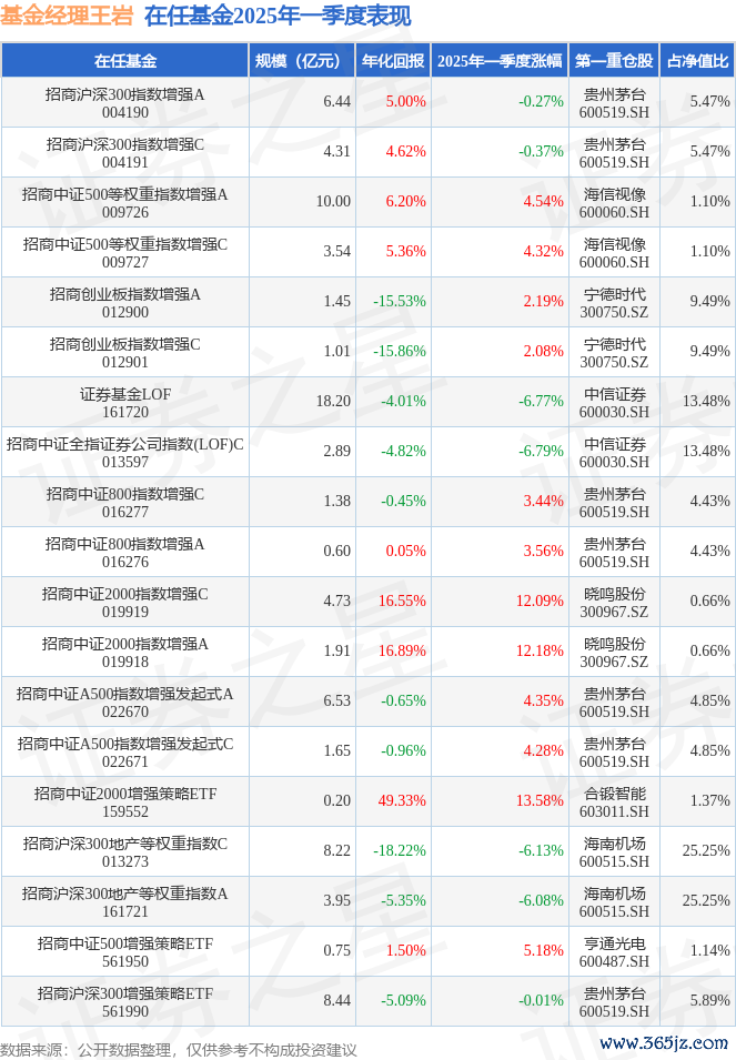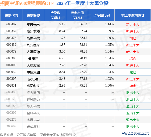 从基金规模来看,招商中证500增强策略ETF基金2025年一季度公布的基金规模为0.75亿元,较上一期规模6989.09万元变化了524.52万元,环比变化了7.5%。该基金最新一期资产配置为:股票占净值比98.98%,无债券类资产,现金占净值比1.04%。从基金持仓来看道正网,该基金当季前十大股票仓位达10.55%,第一大重仓股为亨通光电(600487),持仓占比为1.14%。