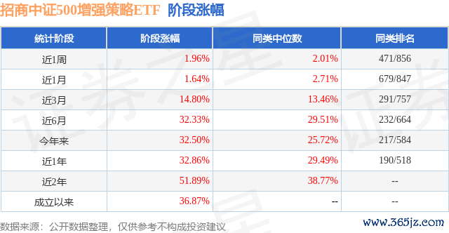 从业绩表现来看,招商中证500增强策略ETF基金过去一年净值涨幅为10.75%,在同类基金中排名204/488,同类基金过去一年净值涨幅中位数为9.36%。而基金过去一年的最大回撤为-17.6%,成立以来的最大回撤为-25.26%。